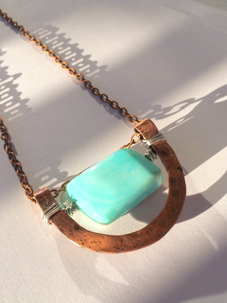 Chunky Boho Blue Opal, hammered copper, large stone pendant, wire wrapped, art nouveau, industrial statement necklace, bold, rustic, hippie http://tuppu.net/a3438fc3