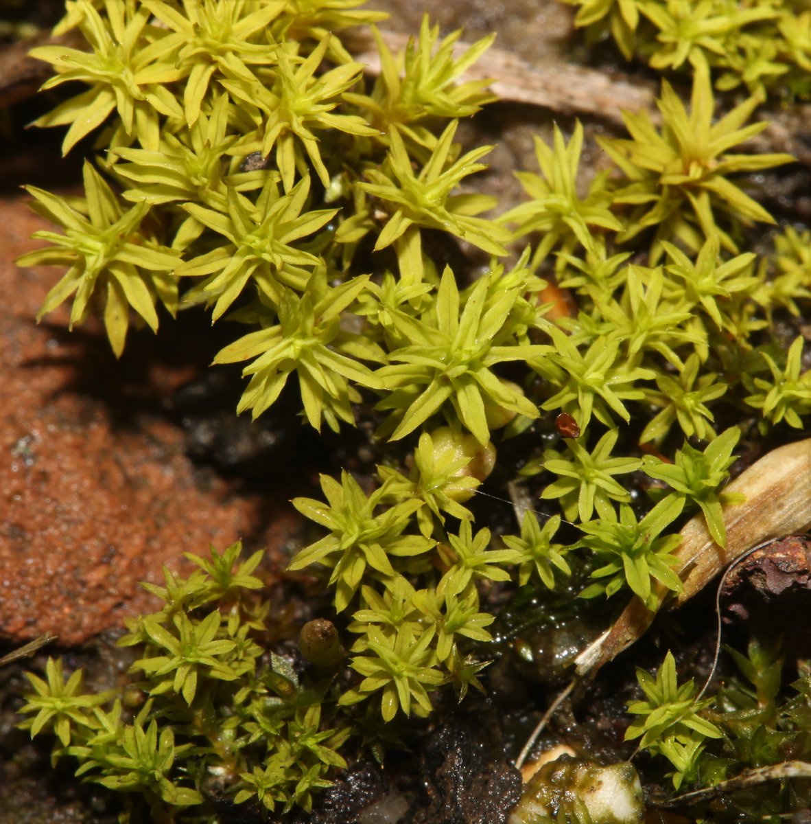 Barbula unguiculata (Bird's-claw Beard-moss), a tiny, common, lemon-green