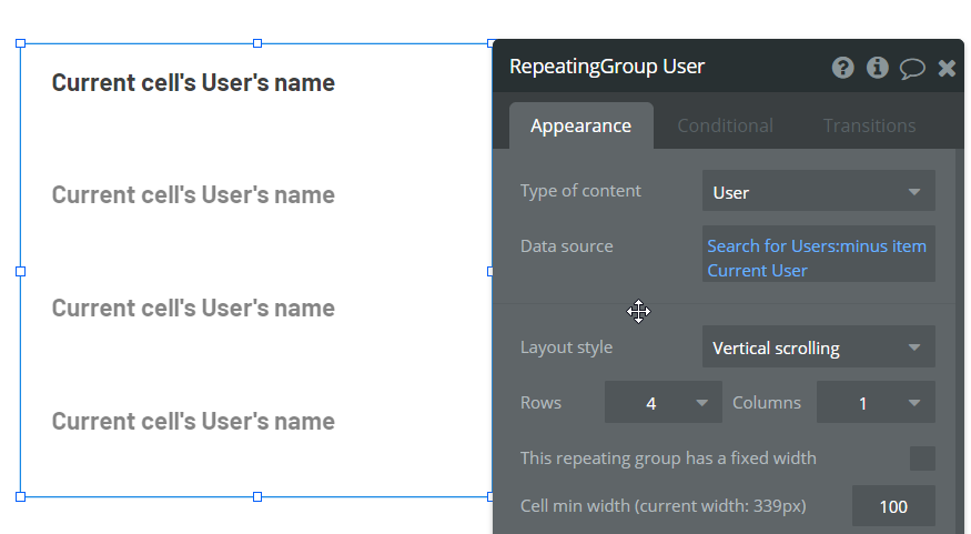Bubble Tip: Want access to 2 datatypes in one repeating group? Unique ids are texts. So u can display unique ids of 1 type & add another things or list of things unique ID. You can go back to datatype through: Search for data with current cells unique ID.