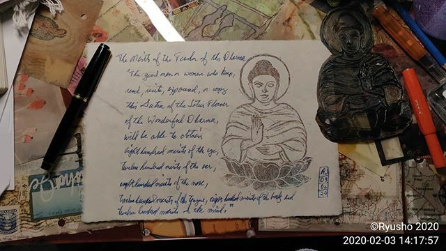 Shakyo meditative sutra copying combined with a lino I previously carved a few years ago. The merits of the teacher of the Dharma.
