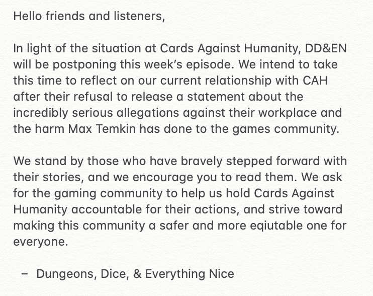 I used to associate a lot with Max Temkin—panels, podcasts, etc.—and at one point rented office at the CAH co-work space. Though I privately started cutting ties years ago, the stories of abuse and mistreatment from