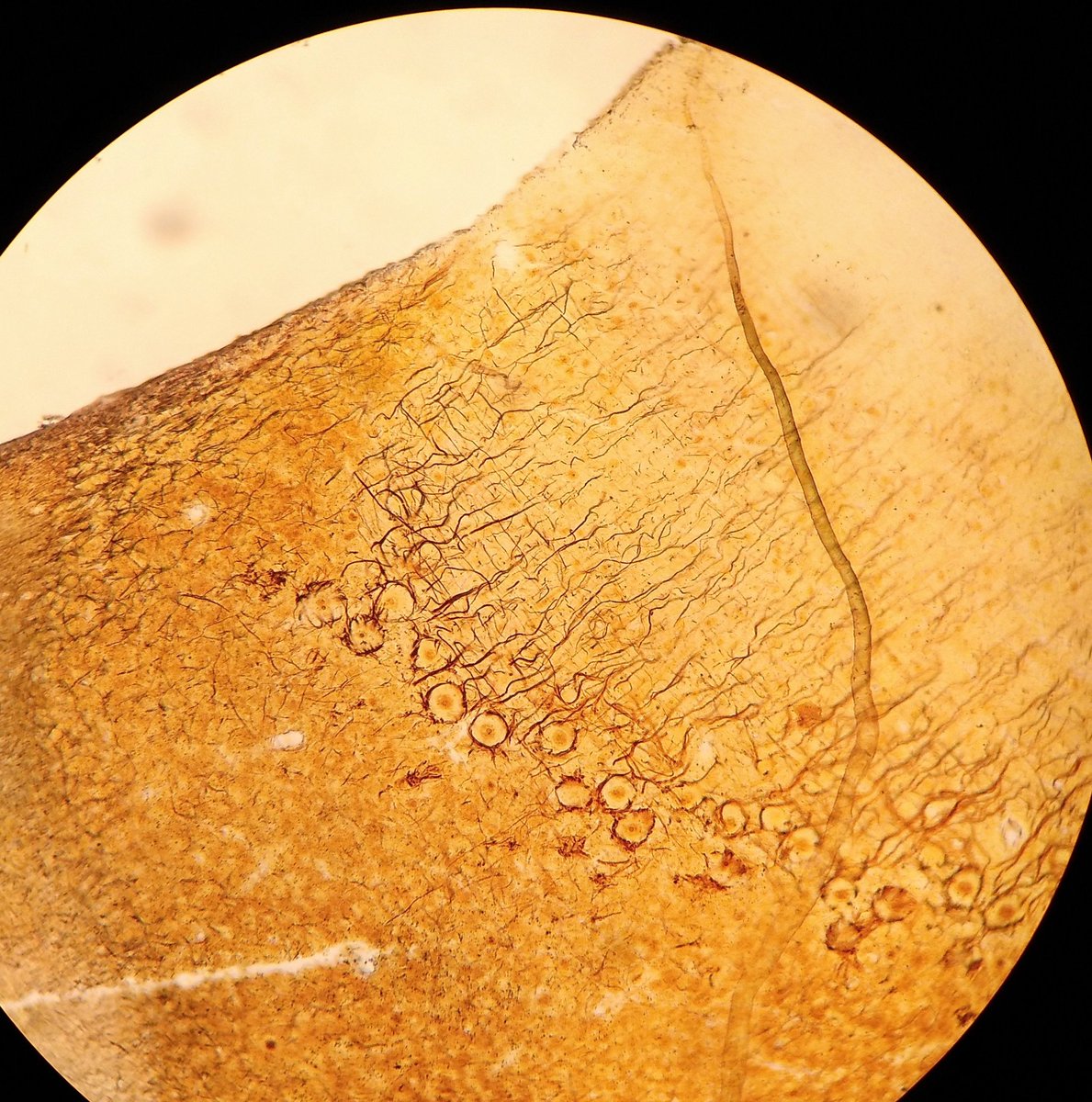Maravillas que me encuentro al mirar un preparado histológico de principios del s.XX (sección de cerebro teñida con una técnica similar a la impregnación argéntica, que desarrolló