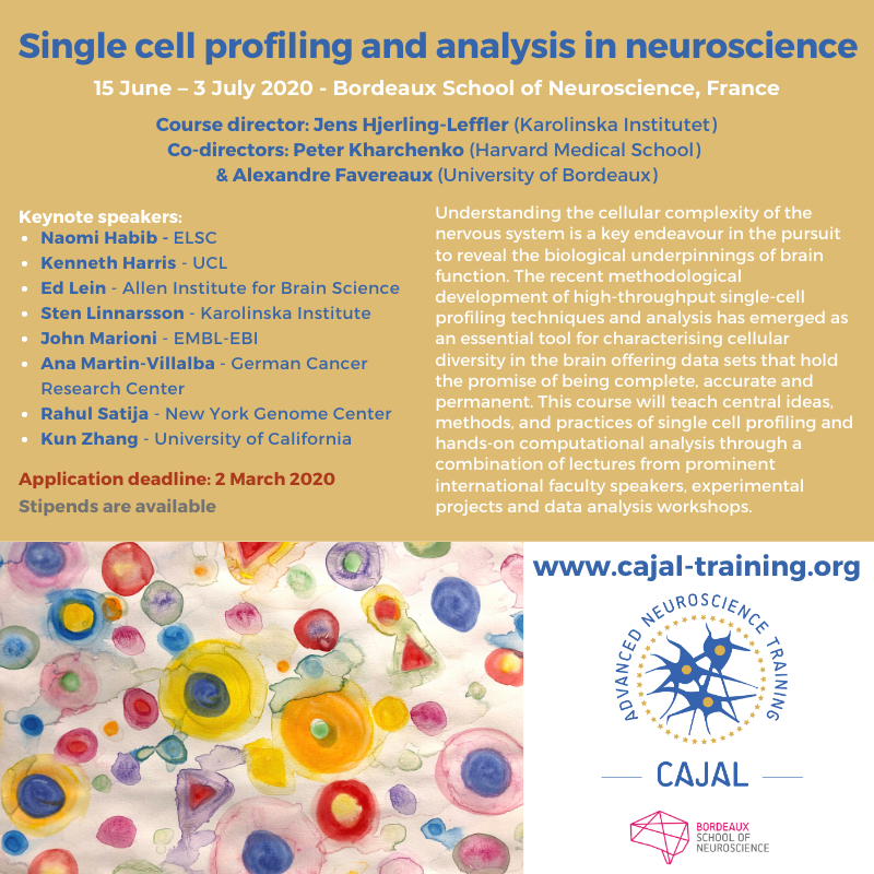 #CAJAL course on Single#cell profiling and#analysis in#neuroscience: https://bit.ly/2tXXSlb Deadline: 2 March 2020 Venue: Bordeaux School of Neuroscience#Stipends are available#Neuroscience#training@bdxneuroschool@ibroSecretariatpic.twitter.com/qcCFVQHAcT