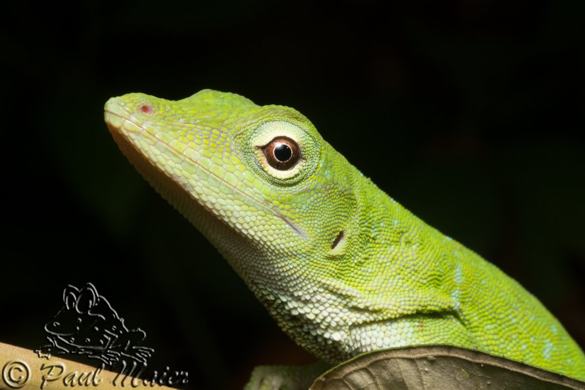 Norops biporcatus, Giant Green Anole, They immediately change color to stripey brown when booped, "Green Anole" may be a misnomer. Color change is possible by contracting or expanding melanin in their pigmented cells—camouflaging themselves to prey upon e.g. stingless bees!