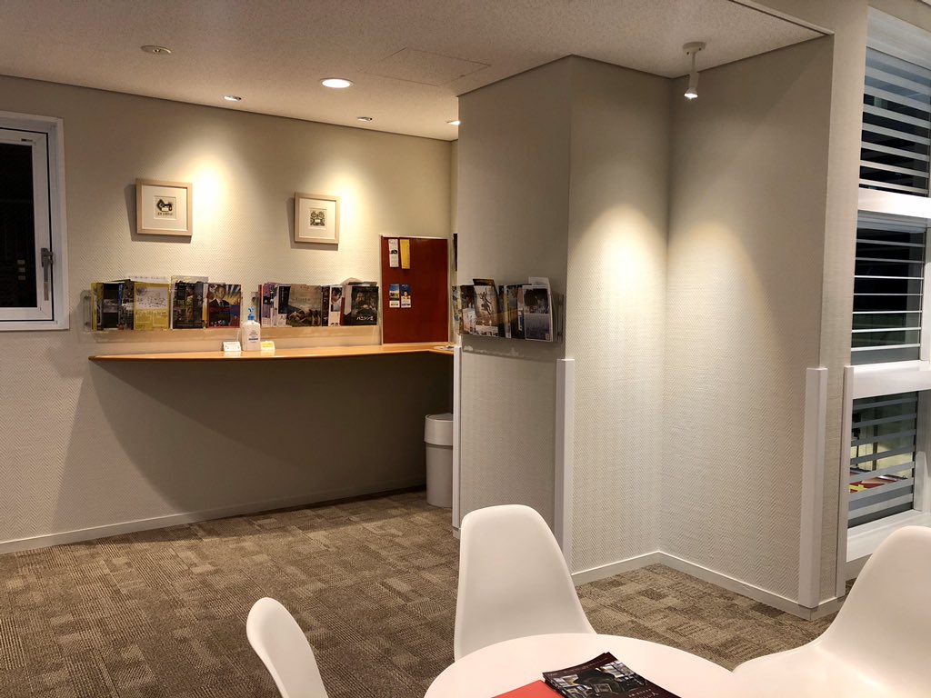ロビー奥の他劇場作品等が並んでいるエリアにあります!