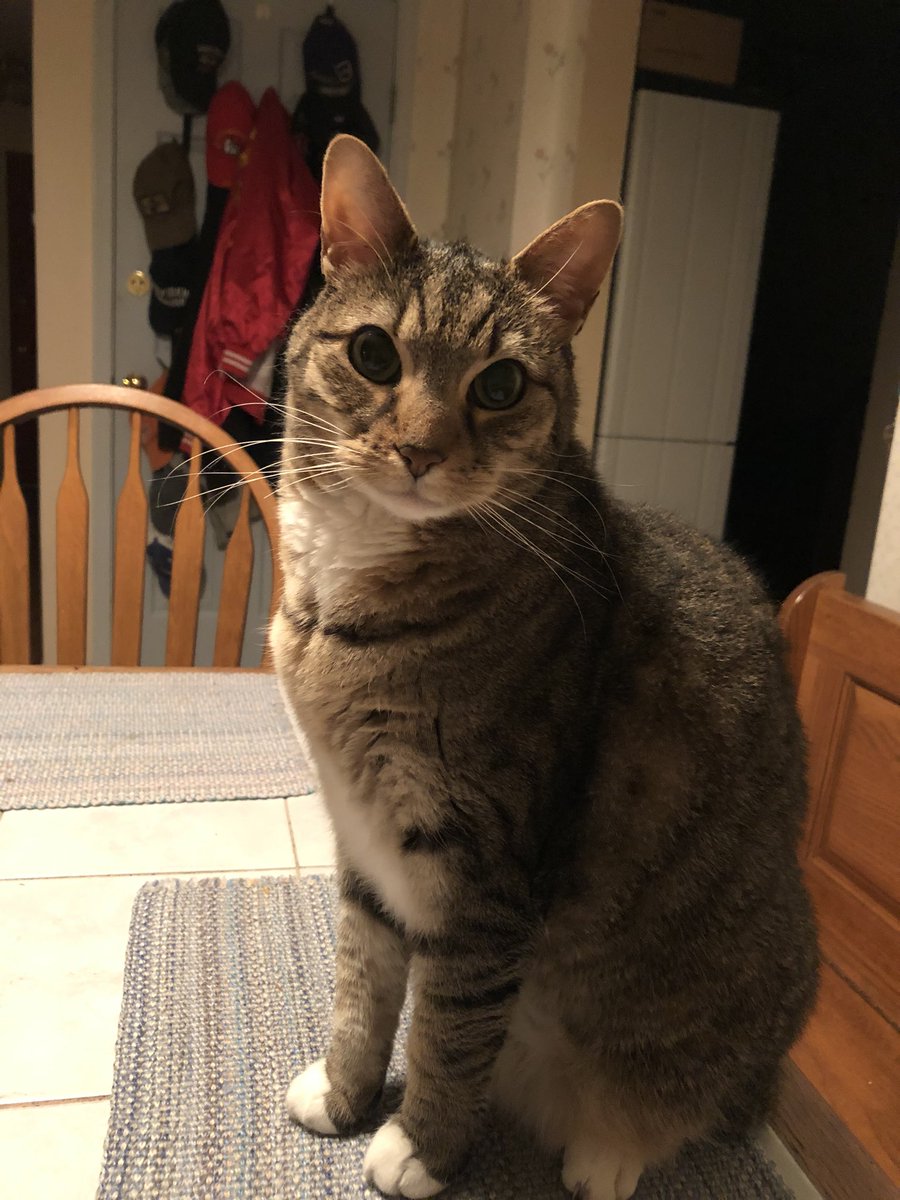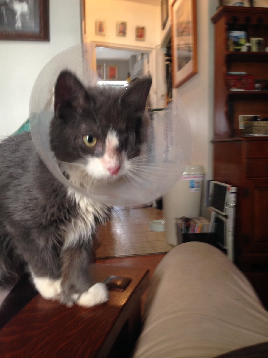First day he ever came home after having emergency eye surgery…Beau the fuzzy bear (cat). He’s a Norwegian forest cat rescue. One eye 24 toes. No job