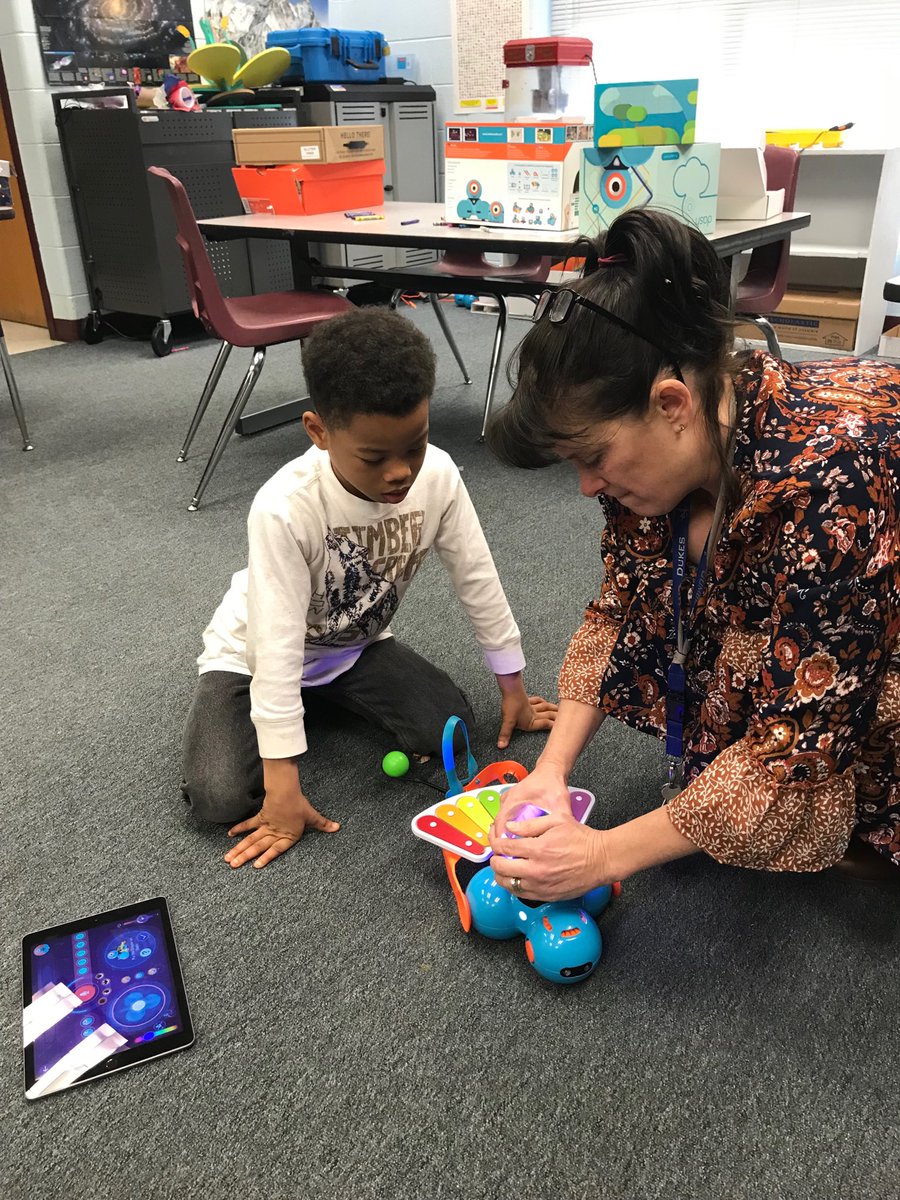 Mrs. Williamson and our 2nd grade friend are coding through hands-on challenges with robot Dash in the STEM lab.
