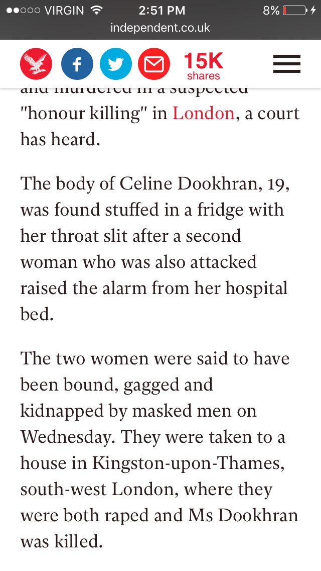 #Honourkilling victim from Kingston, London was killed by Uncle who "became "obsessed" with niece, but realised that she was "beyond his clutches" due to her relationship with her boyfriend, a Libyan Muslim."#VAWG#honourabuse#celinedookhran https://www.thesun.co.uk/news/4092149/celine-dookhran-kingston-murder-victim … -