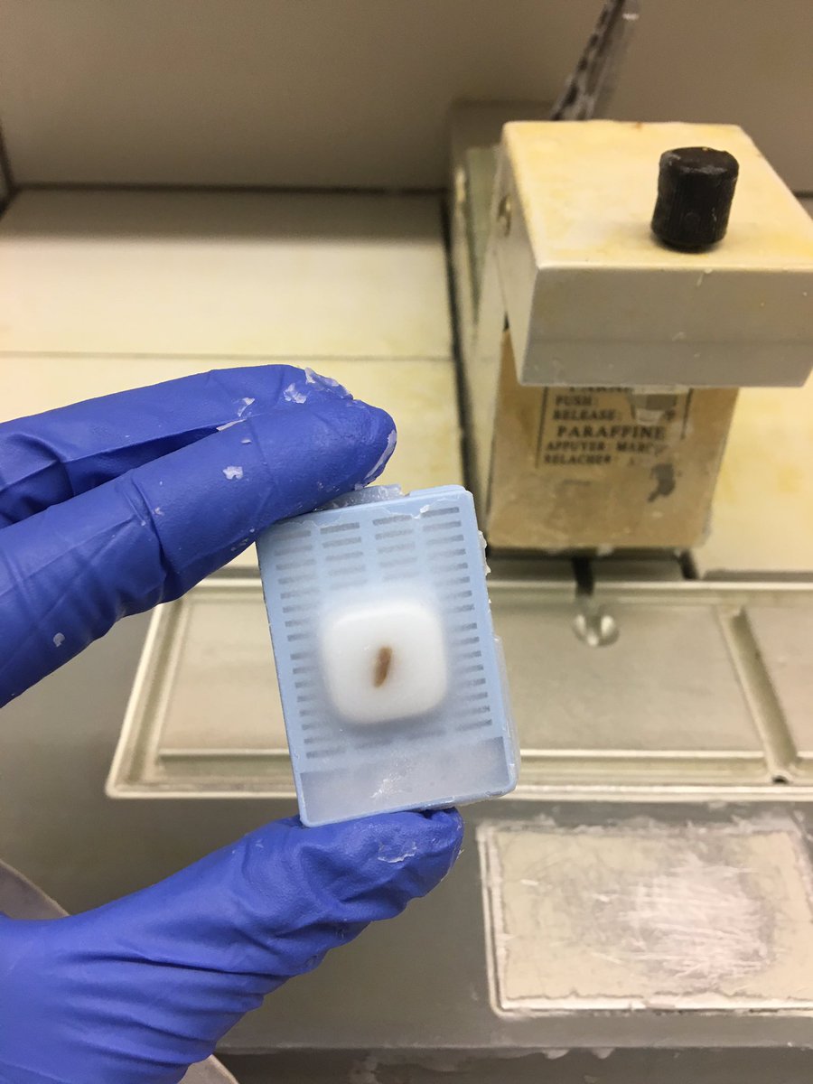 I learned to do tissue processing and embedding during my undergrad and still do my own as a postdoc. Not above it—sometimes precious tissues need your hands the whole way.