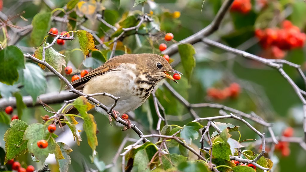 Hermit thrush enjoying a berry delicious breakfast at Sparrow Rock, Central Park.