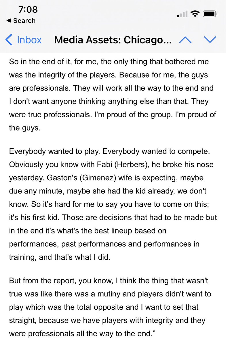 Sounds about right. I don't think anyone at training this past week for the Fire wanted to mutiny in the way that it was said. As per my guess, I think a single player was pissed and inflated the perception of the crisis when he leaked it.