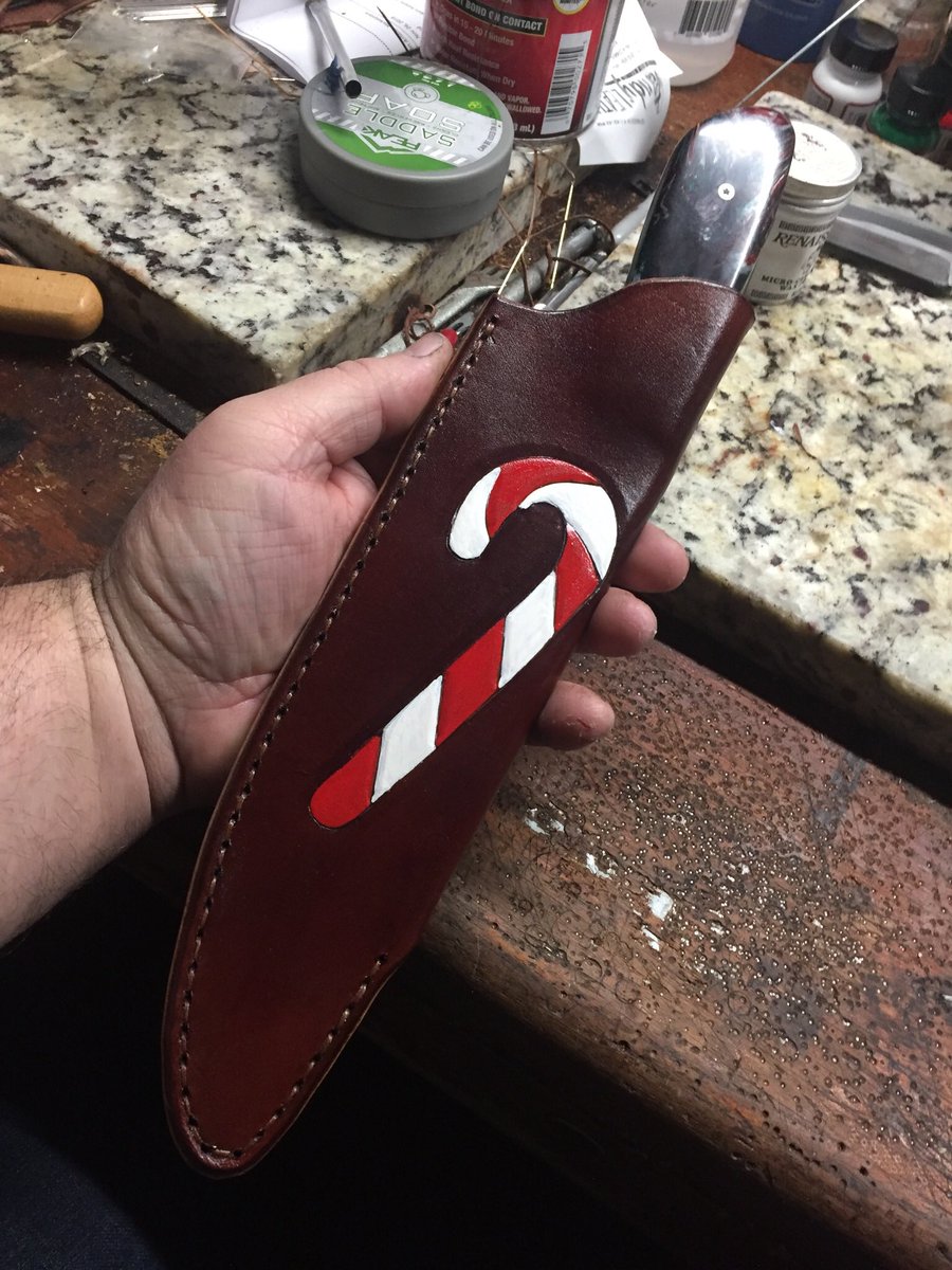 A Christmas inspired chefs knife with hard rock candy handles and hand carved and painted candy cane on the sheath
