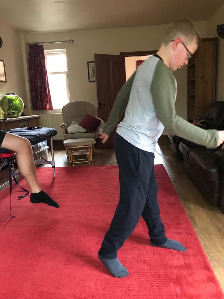 Despite how sad he is he must d his physiotherapy. He is working hard despite feeling so sad and the physio was very demanding this evening. Bojar his Labrador came to console him.