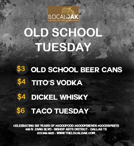 #OldSchoolTuesday at#TheLocalOak!! Come on over and warm up with us!! Order our#TacoPlate or a bowl of our famous#Chili and wash it down with an#OldSchoolCan,#Titos or#Dickel! Keep#BishopArts LOCAL, ECLECTIC & INDEPENDENT!#TLO#OakCliff#EatLocal#DrinkLocalpic.twitter.com/Wv8uXpCorq