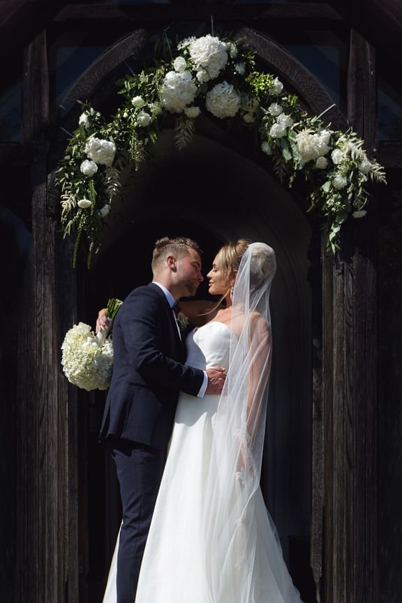 Gorgeous Newlyweds Mel & Jake under their pretty flowered arch at St Catherine's Church @gosfieldhall