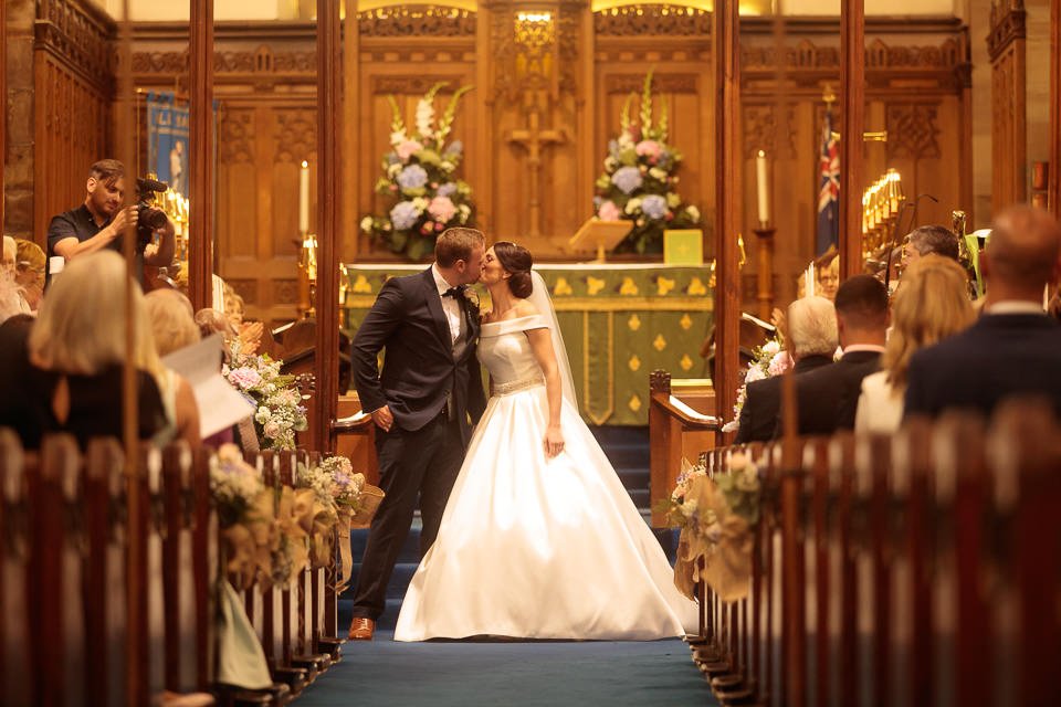Bride and Groom have a quick kiss at the Altar after having exchanged their vows