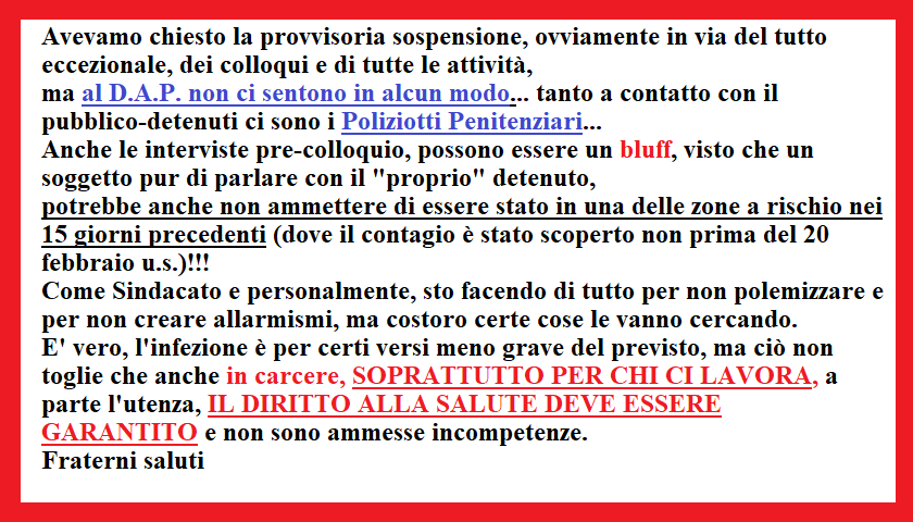 #coronavirus#carceri#poliziottipenitenziari Ma secondo Voi#cisono o#cifanno? Sospendono le operazioni di#controllo dei familiari da parte dei#cinofili... e ok. Ma....e il Personale di#PoliziaPenitenziaria degli#istituti, che i controlli cmq li deve continuare a fare?pic.twitter.com/bha8ZZ1clQ