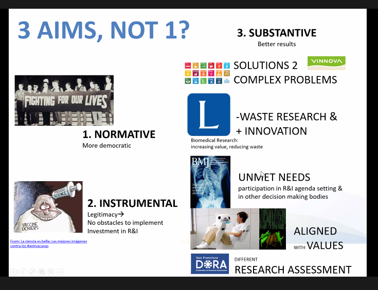 PARTICIPATORY APPROACHES, WHY? 1Enable more democratic R&I 2Increase legitimacy of R&I 3Achieve greater impact by answering unmet needs + aligning R&I with societal values