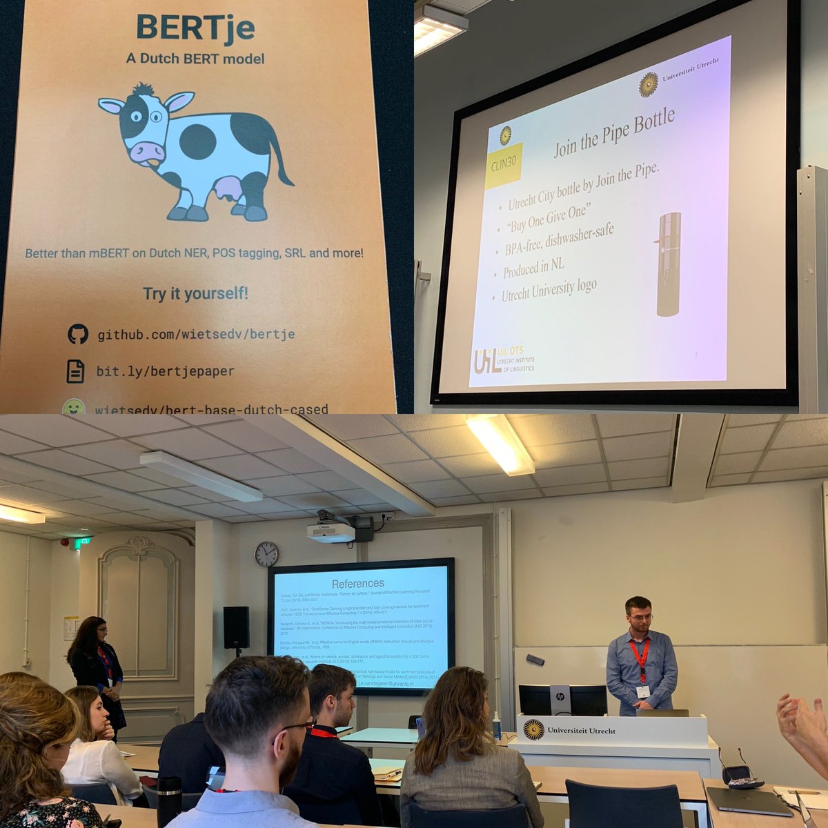 #clin30. Presented an ongoing work on Dutch cognitions/reviews polarity analysis. Also got a cool water bottle, nice to see such initiatives for reducing plastic. Plus only vegan lunch!#NLProcpic.twitter.com/28Ho7roORa
