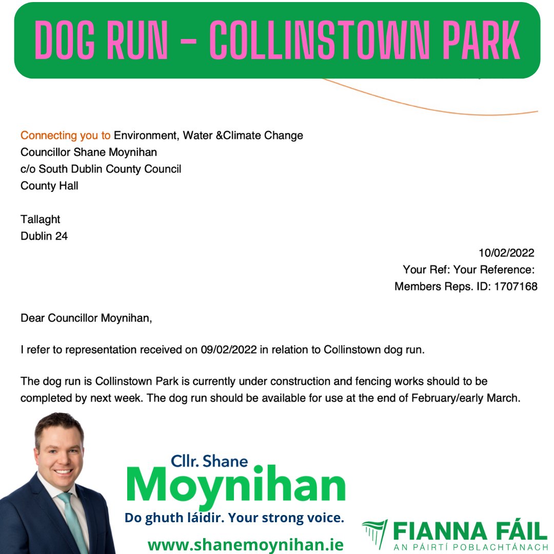 The new dog run in Collinstown Park will be available for use at the end of February or early March. Well done to all who campaigned for this facility.
