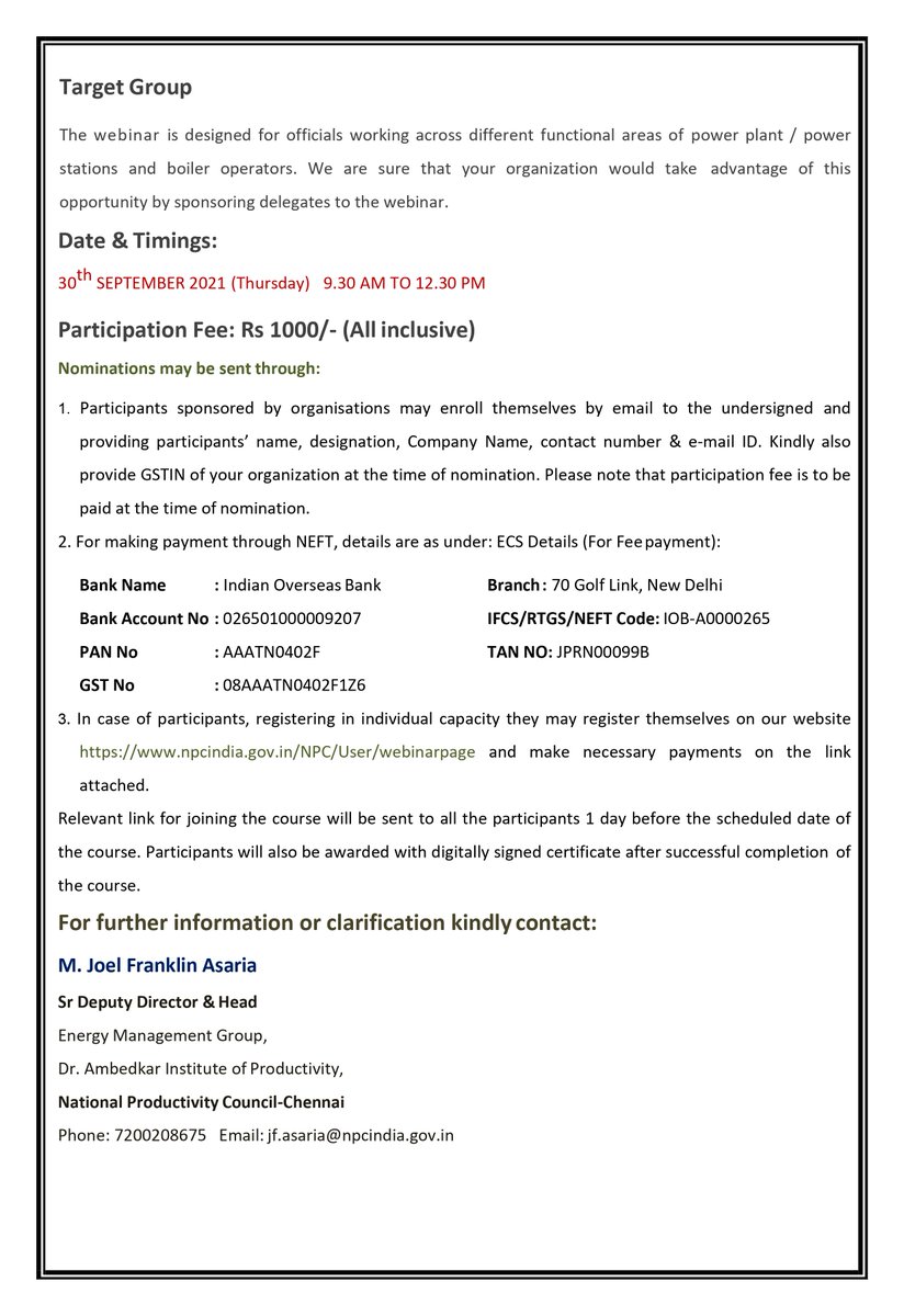 Webinar on"Coal/Lignite Combustion Problems, Its Remedial & Safety measures" Register Now:-https://www.npcindia.gov.in/NPC/User/webinar_registration?course_select_id=MTUyOA== … Contact:-: 7200208675/ jf.asaria@npcindia.gov.in Date:-30th SEPTEMBER 2021 Fee:-Rs 1000/- (All inclusive)