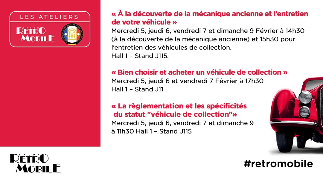 À l’occasion du salon, la FFVE propose aux visiteurs des ateliers dédiés pour tout comprendre aux #véhicules de#collection, de l’#achat à la#restauration en passant par la#réglementation.