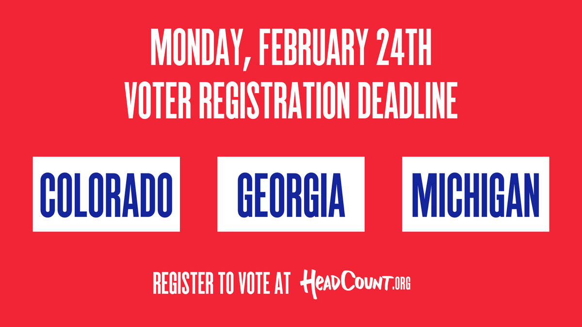 #RegisterToVote in#Colorado,#Georgia, and#Michigan is coming up on Monday, February 24th. Don't forget to mail in your forms!#TheFutureIsVoting | Register to vote at http://HeadCount.org pic.twitter.com/ptT0UkGgqH
