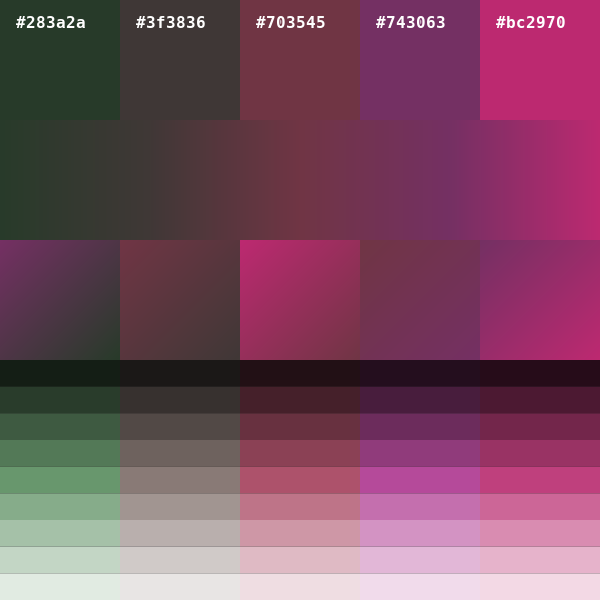 #283a2a#3f3836 #703545 #743063#bc2970#generative#design#colors#colorScheme#palette Download it from: http://palett.es/283a2a-3f3836-703545-743063-bc2970 …pic.twitter.com/PGWF072mKV