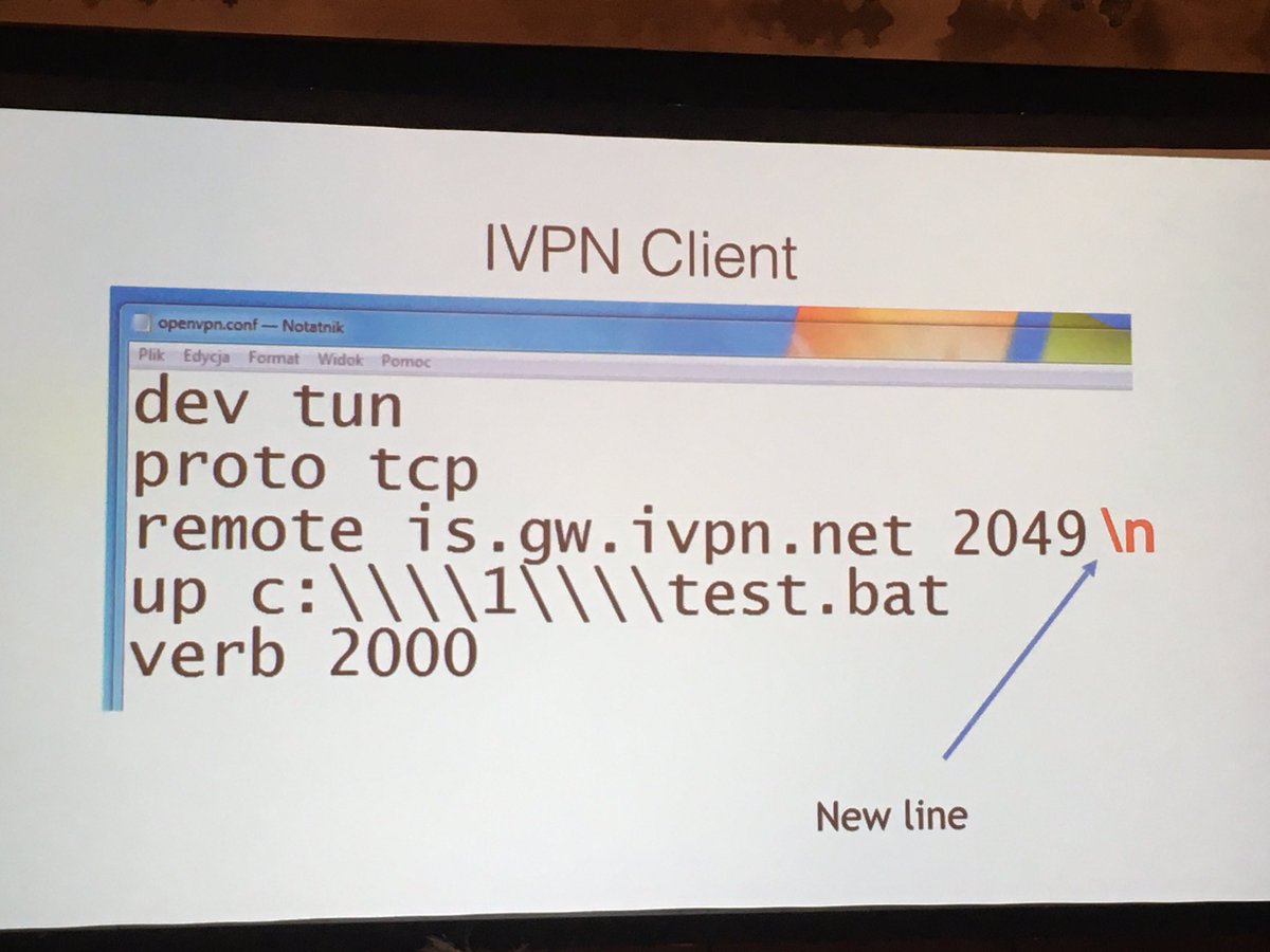 #CONFidence2017 on how to escalate priv using 3rd party tools (OpenVPN) pic.twitter.com/ylf0lDtksk