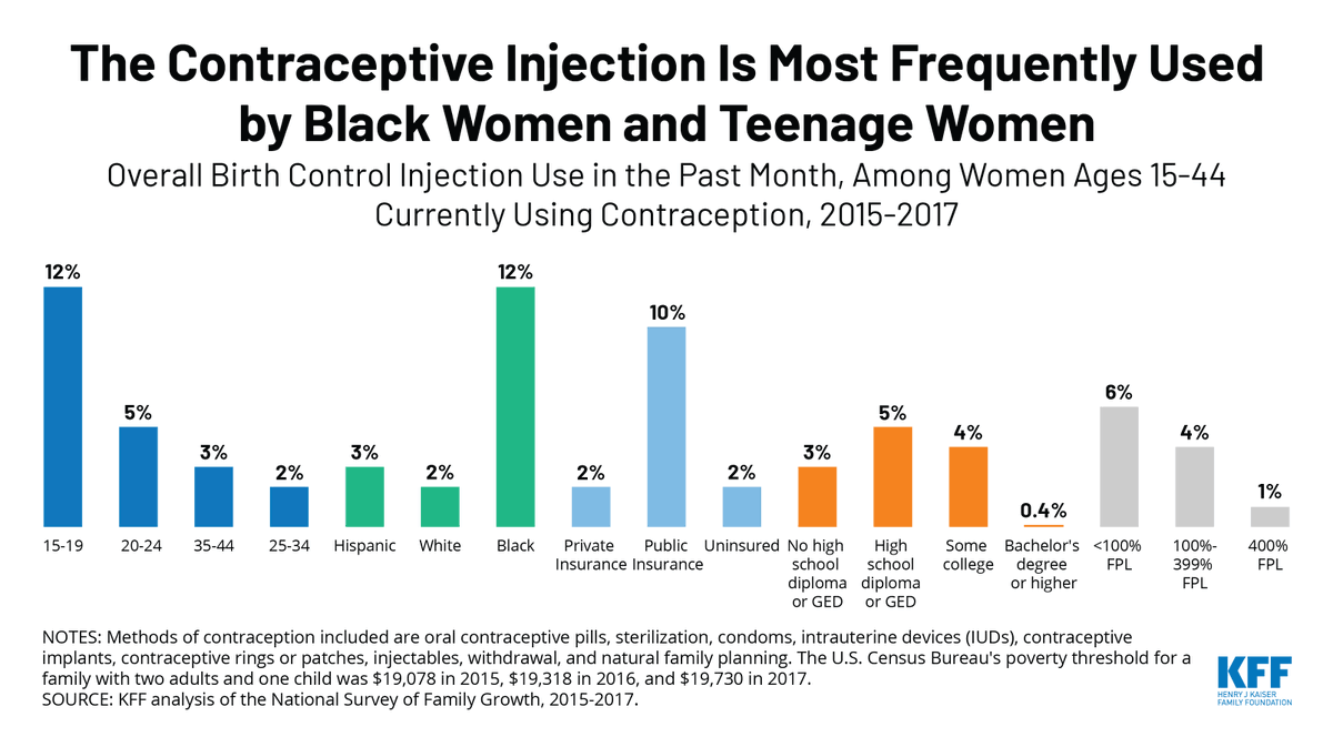 #contraception use the DMPA contraceptive injection – aka “the shot” or Depo Provera. It is most often used by young women, lower-income women, and Black women. https://www.kff.org/womens-health-policy/fact-sheet/dmpa-contraceptive-injection-use-and-coverage/ …pic.twitter.com/CNC5CFpvIy