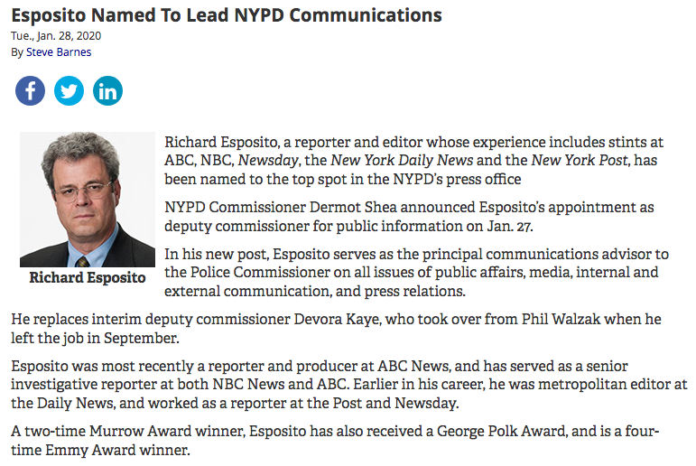 "Richard Esposito, a reporter and editor whose experience includes stints at ABC, NBC, Newsday, the New York Daily News and the New York Post, has been named to the top spot in the NYPD’s press office" https://www.odwyerpr.com/story/public/13724/2020-01-28/esposito-named-lead-nypd-communications.html …