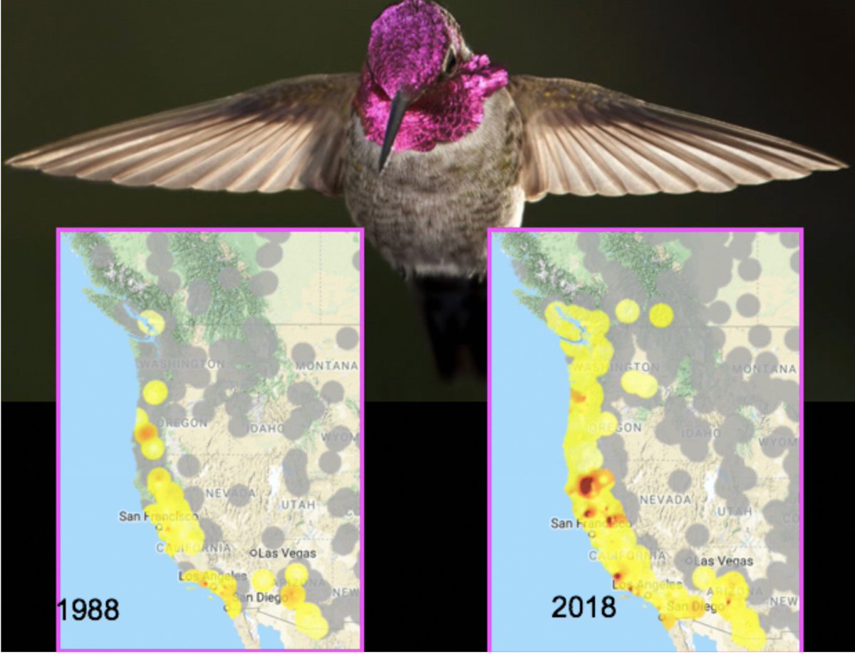 #BOU18TC Feeding also changing distributions. Gorgeous & tiny Anna’s hummingbirds have moved N due to more feeders.#CornellBirds. Now they are remaining in winter dependent on heated feeders. Should we be concerned? pic.twitter.com/ryCePYBEnr