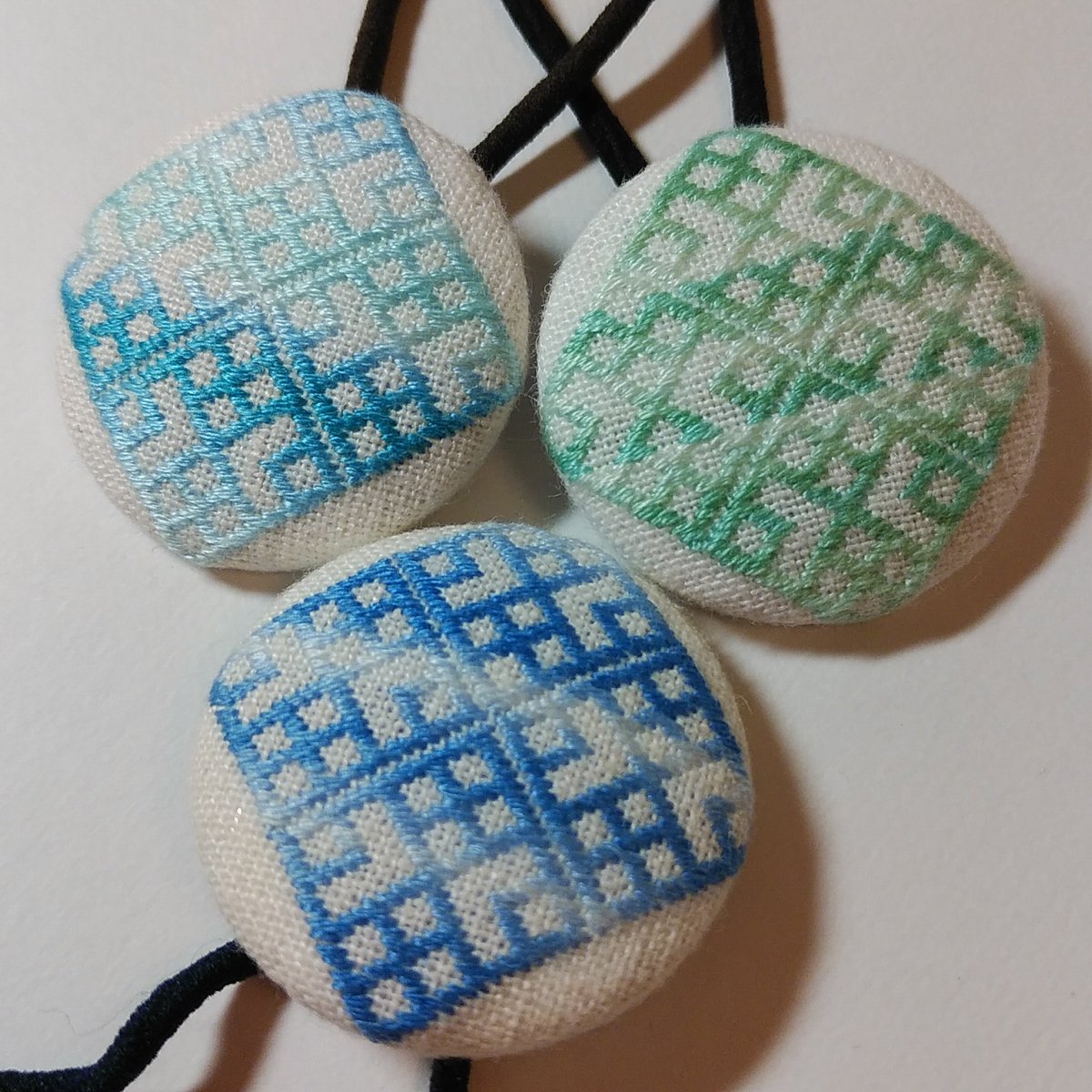 こぎん刺しのくるみボタンでヘアゴム。これもモドコは四ッコゴリ。糸はコスモ刺繍糸シーズンズの2本取り。