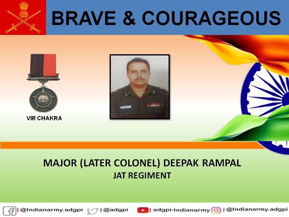 #OperationVijay Major Deepak Rampal led a successful attack to capture Point 4875 and repulsed three enemy counter attacks. Displayed exemplary#determination and conspicuous#courage. Awarded#VirChakra. https://www.gallantryawards.gov.in/awardee/2720 pic.twitter.com/ZdOo6mMuhL