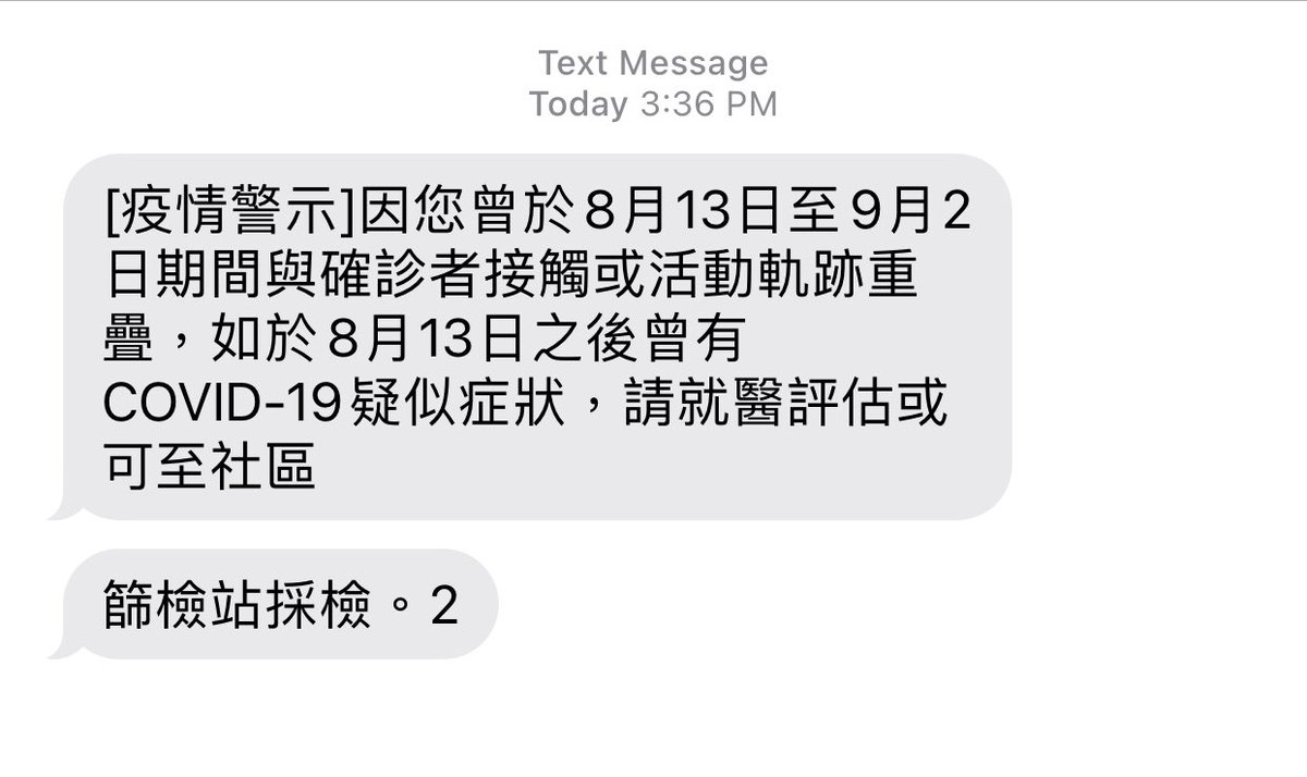 #Taiwan’s CECC, informing me that my travel history within Taipei May have overlapped with one of the confirmed#COVID19 case and if I have any suspected symptoms, I should go consult a doctor or get tested. pic.twitter.com/0sG8qwYMxm