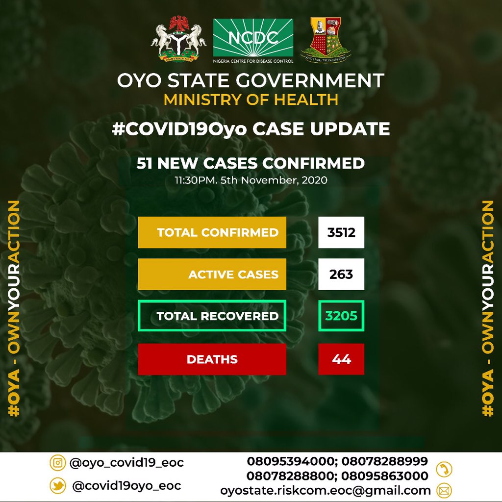 #COVID19 OYO CASE UPDATE 3rd Nov, 2020 - 4 New Cases Confirmed 4th Nov, 2020 - 5 New Cases Confirmed 5th Nov, 2020 - 51 New Cases Confirmed There is an increase in COVID19 confirmed cases in the state. Please stay safe. pic.twitter.com/qcTokWfYbb