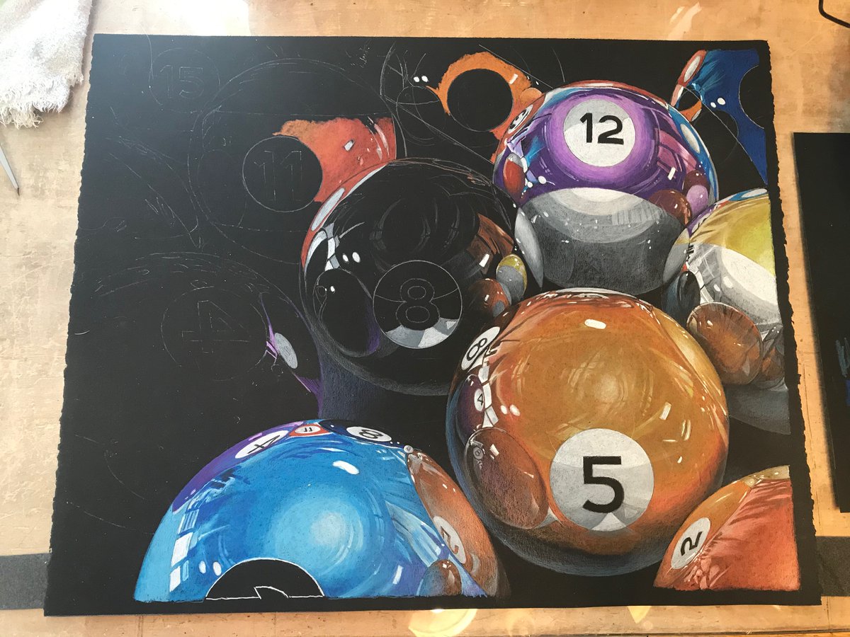 WIP 22x18inch. "Billiard Balls" 30 hours to this point. Fine tuning the 12 and 10 ball