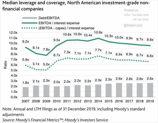 Investment-grade corporate leverage is higher than in 2008-2009, but interest coverage has improved.