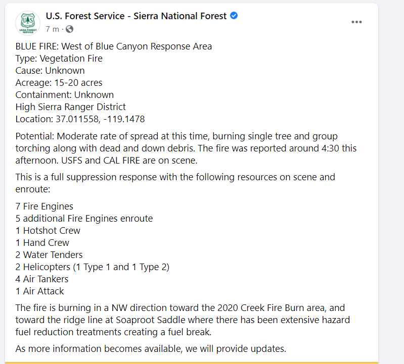 #BlueFire in Sierra NF near Soaproot Saddle Rd & Big Creek Rd. Last report was 15-20 acres, moderate ROS burning N/W towards the#CreekFire scar. AA15 + T76 T78 T82 & T83 have been working the fire, began around 4:30pm. https://www.facebook.com/SierraNF/ pic.twitter.com/ZhmqEjSHn6