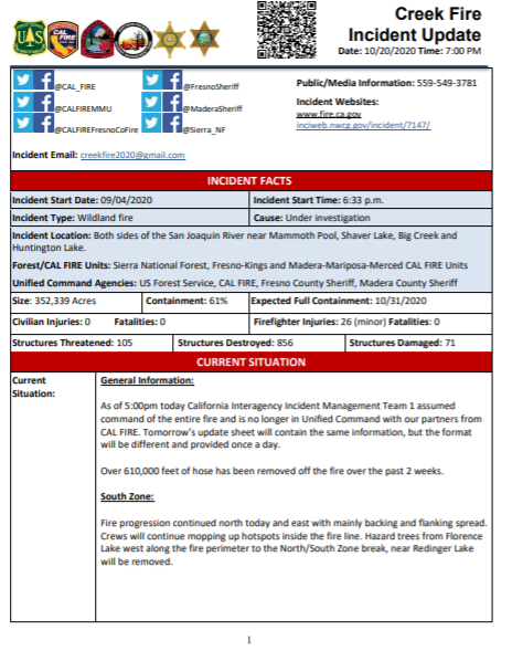 #CreekFire Northeast of Shaver Lake in Fresno County remains 352,339 acres and 61% contained. Unified Command:@FresnoCoFire,@Sierra_NF, and@FresnoSheriff https://www.fire.ca.gov/incidents/2020/9/4/creek-fire/ …pic.twitter.com/aKTGoisvxu