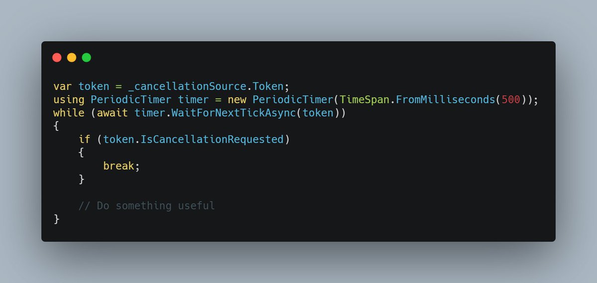 #csharp is pretty neat. It is async, means no more async void. It is also disposable, so don't forget to dispose ;) Source code: https://github.com/dotnet/runtime/blob/main/src/libraries/System.Private.CoreLib/src/System/Threading/PeriodicTimer.cs … Announcement: https://devblogs.microsoft.com/dotnet/new-dotnet-6-apis-driven-by-the-developer-community/#modern-timer-api …pic.twitter.com/u5abA7JJqp