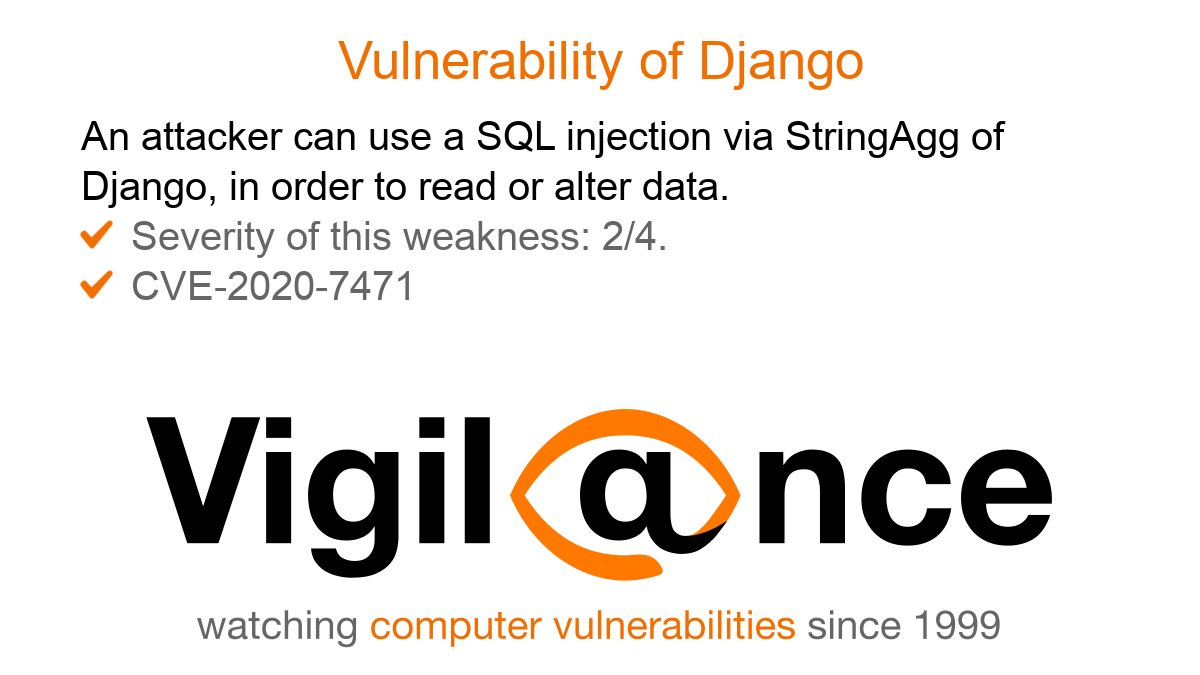 #Vulnerability of Django: SQL injection via StringAgg. https://vigilance.fr/vulnerability/Django-SQL-injection-via-StringAgg-31500 … Identifiers:#CVE-2020-7471.#securitypic.twitter.com/Uef0dg3C1t