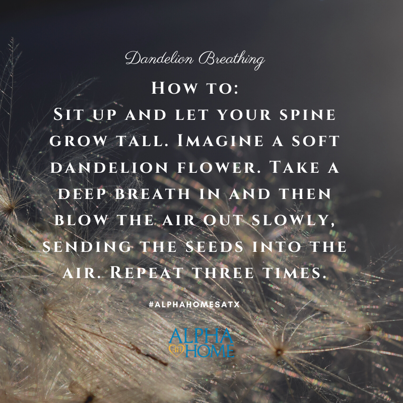 it up and let your spine grow tall. Imagine a soft dandelion flower. Take a deep breath in and then blow the air out slowly, sending the seeds into the air. Repeat three times.