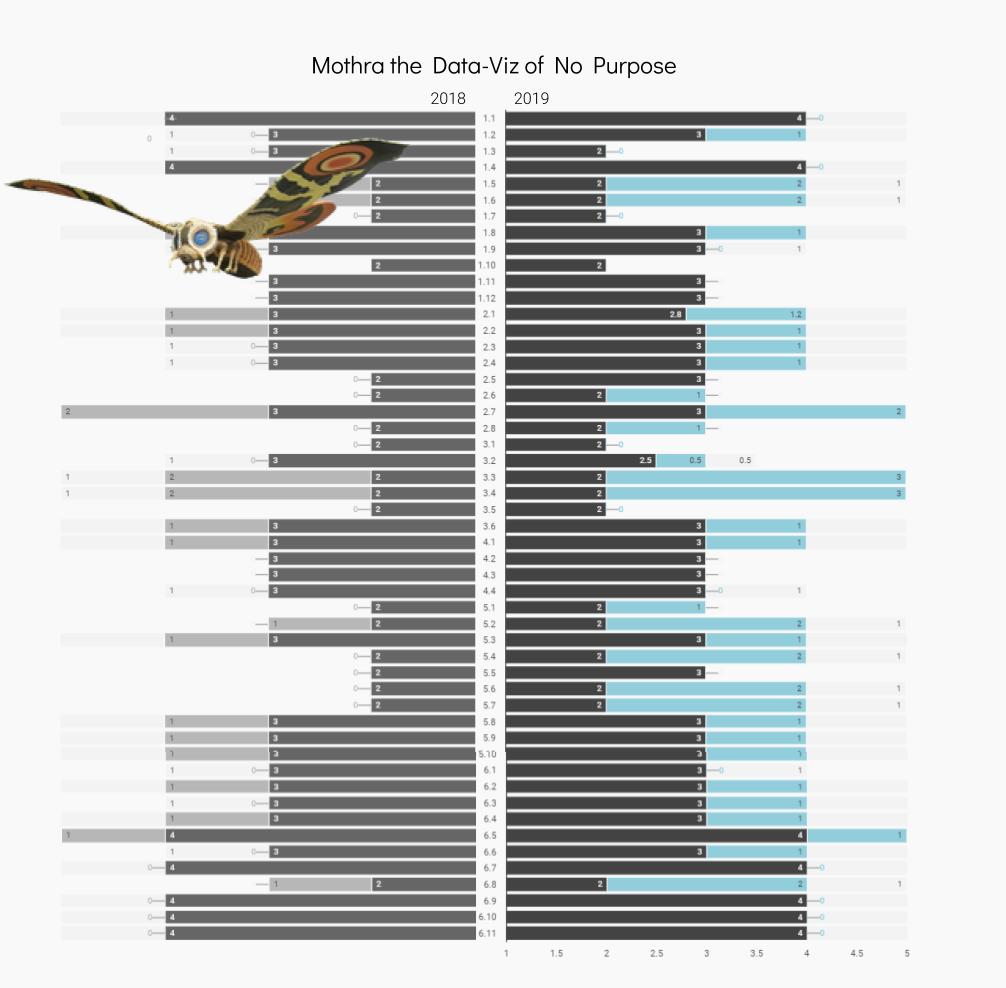 I haphazardly try stuff for no reason other than to find out "WTF does this do" which invariably leads to "I honestly don't know WTF I'm doing!' Case in point, Mothra the Data-Viz of No Purpose. Hard face palm & a timeout from