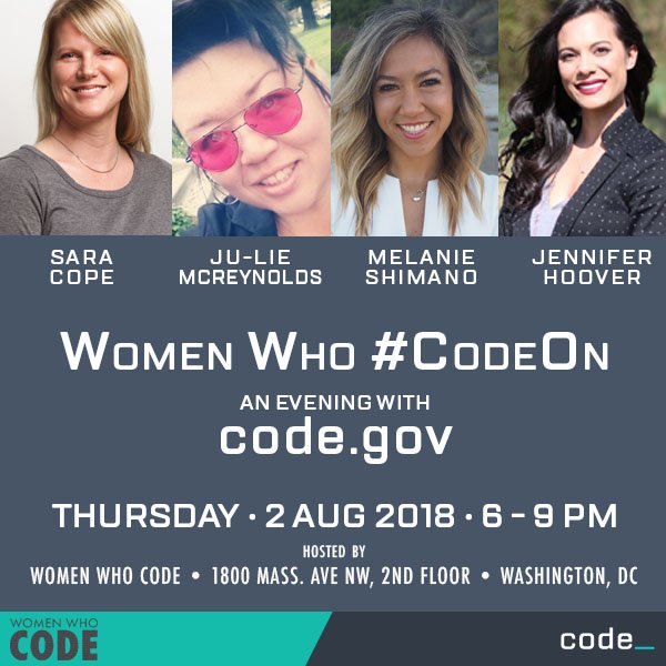 #CodeOn, an evening with@CodeDotGov and@agencyCHIEF ! Join us and learn how you can get involved with open source code in government.#dctech Sign up: https://www.meetup.com/Women-Who-Code-DC/events/252868523/ …pic.twitter.com/GfGV5a5Ibo