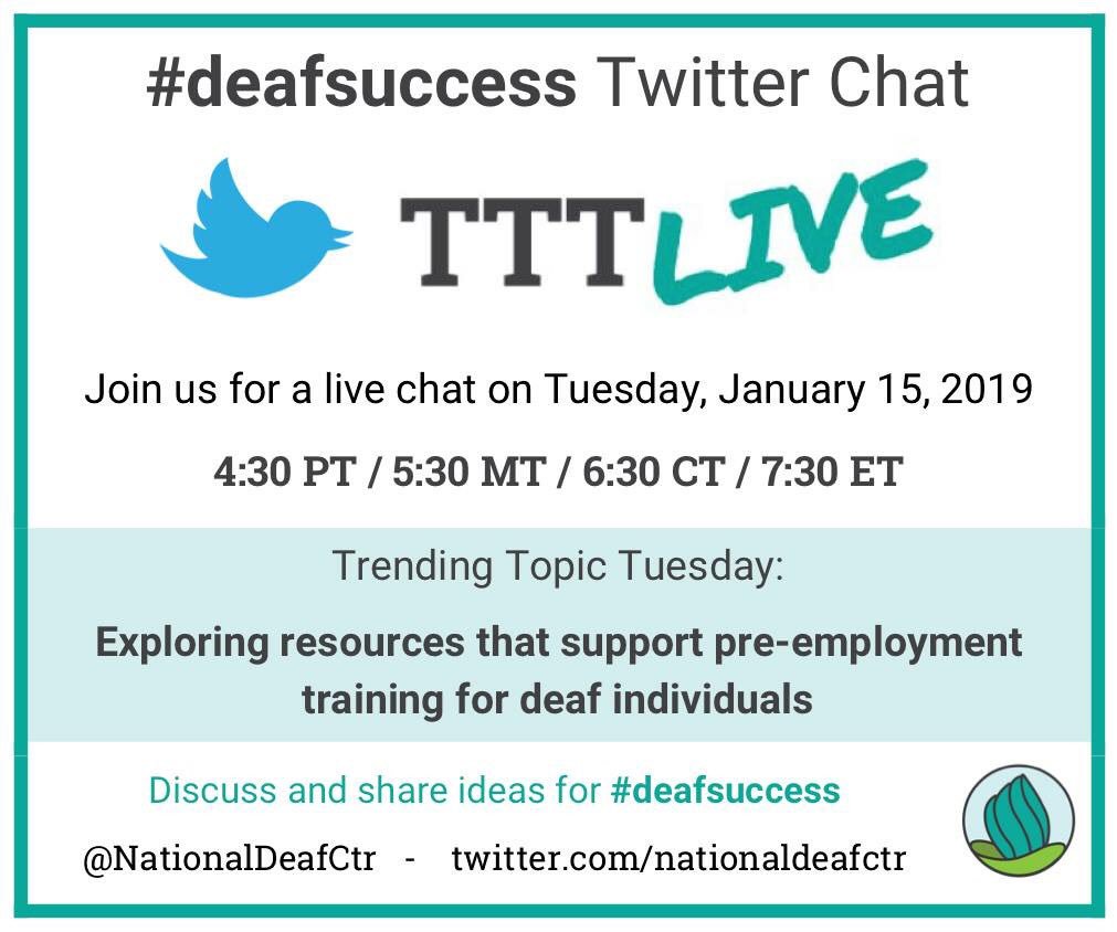 #deaf individuals. Everyone is welcome! The#deafsuccess twitter chat will take place 1/15 at 4:30 PT/7:30 ET for 1 hour. Questions will be released next week.pic.twitter.com/Z0vCBfgRDA