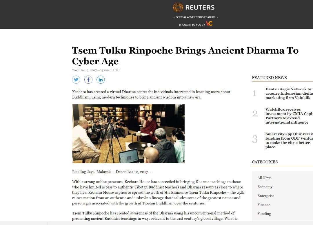 (From Admin) Media giant Reuters features Tsem Rinpoche bringing Dharma to the Cyber age: https://www.reuters.com/brandfeatures/venture-capital/article?id=22970 …