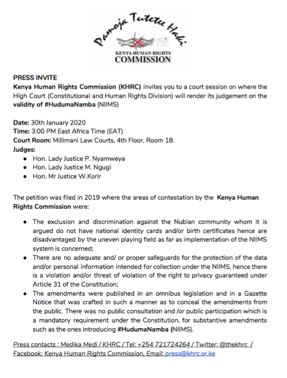 Kenya Human Rights Commission (KHRC) invites you to a court session on where the High Court (Constitutional and Human Rights Division) will render its judgement on the validity of