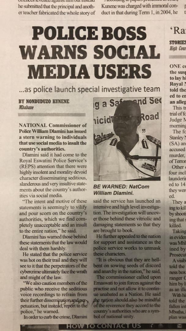 #Eswatini threatens social media users.#PoliceCommissionerDlamini says social media users are “highly insolent, morality devoid characters disseminating seditious, slanderous, very insulting statements about country/authorities via social media”#DIGITALRIGHTS are#HUMANRIGHTS:pic.twitter.com/jsliEEC47j