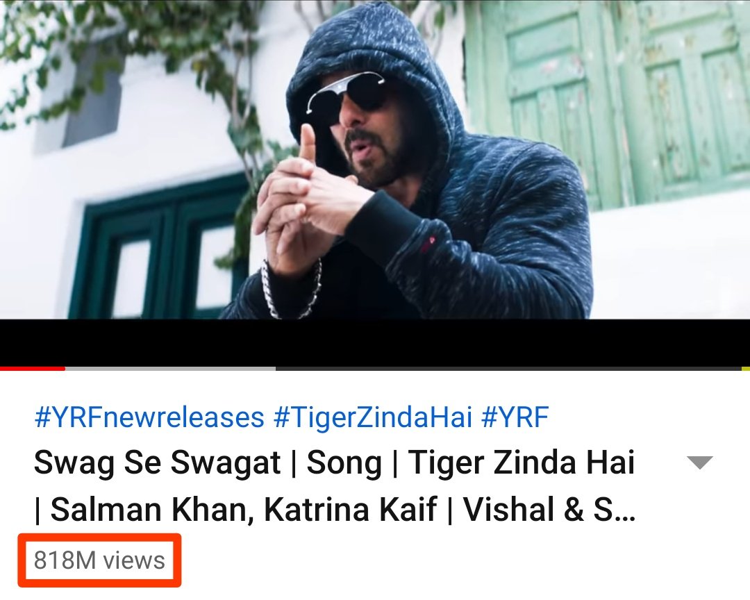 #SwagSeSwagat - 818M •#AankhMareyLyrical - 780M •#Dilbar -733M •#AankhMarey -722M •#ChamCham -670M •#BadriKiDulhania -659M •#JahaTumRahoge -627M •#KalaChashma -626M The Undisputed King Of YouTube#SalmanKhan